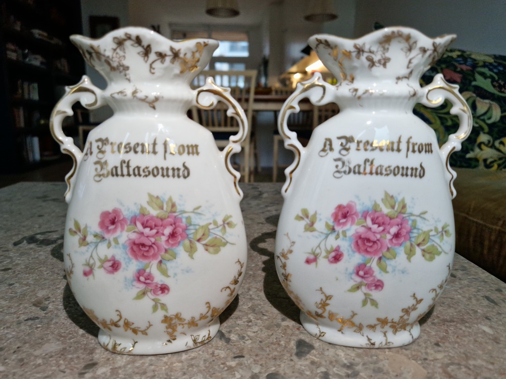 When I married Olle in the 1980’s I came across all sorts of items on the farm on Tjörn that I wasn’t used to in England – an electric coffee maker, wooden butter knives and clogs, to name a few. But in one cupboard I discovered two identical china vases, about 15 cms tall and highly decorated, which could have come directly from a Victorian British home. They were fancy little items and being almost flat were clearly designed to be displayed on a narrow shelf or mantelpiece. Judging from their style I guessed they’d been made around 1900. Even I , no expert, could see they weren’t of the highest quality and when I turned them over there wasn’t a well-known name on the bottom, just a number. But what caught my eye were the four words in English written proudly near the top in gold, gothic lettering, “A Present from Baltasound.”< /h3>