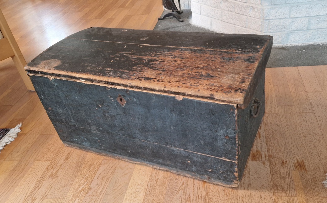 As proof of the family’s maritime connections, there are two seamen’s chests in the farmhouse. Both chests show signs of age and are more likely to belong to the nineteenth than the twentieth century, which points to their having belonged to an earlier generation. I guess they belonged to Emanuel and Albin. two of Olle’s uncles and both merchant seamen in their youth. Sea chests like ours are common on the island and are practical objects. We used to use the smaller, simpler sea chest to hold old newspapers for lighting the fire, but as we don’t use the brick fireplace anymore (or read actual newspapers come to that) we haven’t touched it for years. The chest is hard to date, but I’d guess from the handmade iron nails which hold the chest together and the thin wrought iron handles on either side, that it is from the last decades of the 1800’s. It measures 75 by 40 cm and is 34 cm high. It has a slightly rounded top - enough to allow any water to run off - but is flat enough to make a practical stool or to place objects on it without their rolling off. Its lock and key have been removed as these were expensive items to be re-used when the original chest fell out of use. It’s painted a very dark green colour, presumably to protect the wood from damp, but on one side the top has been rubbed entirely bare of paint – perhaps that’s where the owner sat most often.
